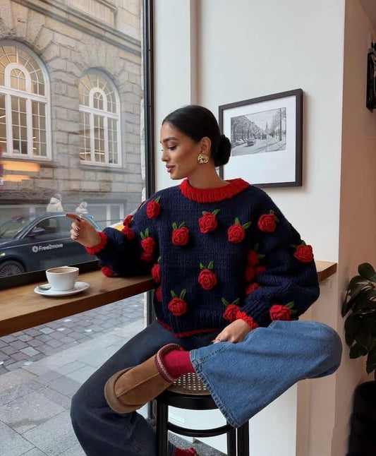 leilayca Handmade Navy Blue Sweater With Red Roses,Handmade Floral Knit Pullover,Cozy Cottagecore Jumper,Gift For Woman Gift For Christmas
